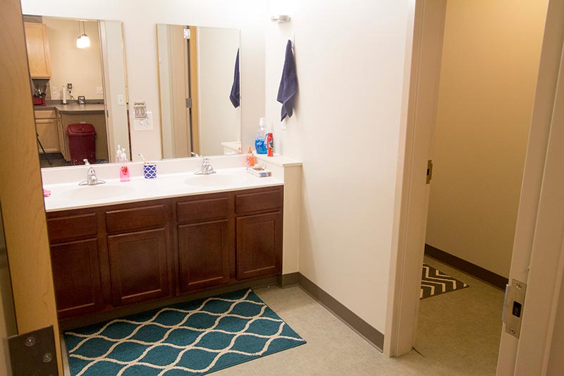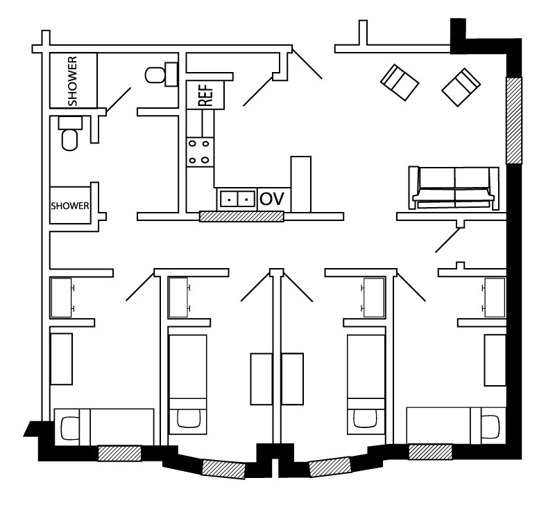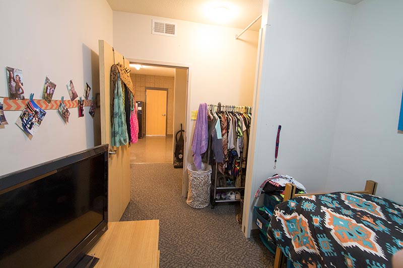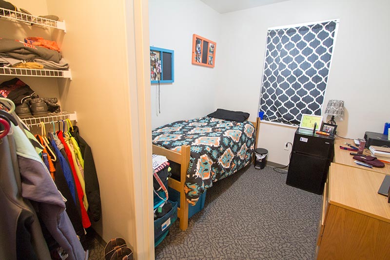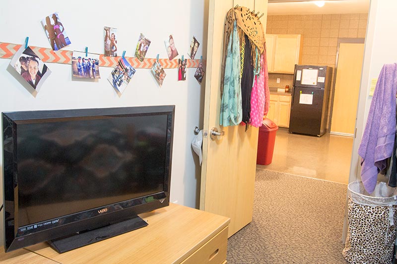 Each residence hall suite features two to four private bedrooms furnished with a bed, chest of drawers, a desk, and a chair. The suites feature a closet, two bathrooms, a living room, and a kitchen area with stove, microwave, refrigerator, and freezer. Each room has a Roku stick and is wired for high-speed Internet access.